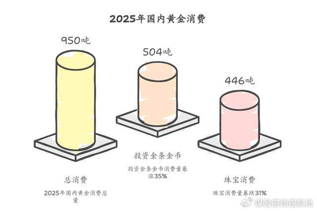 2025年全年,国内黄金消费950吨,其中投资金条金币暴涨35%,冲到504吨。而珠宝消费呢?暴跌31%。这组数据说明什么?大家不是真喜欢黄金,大家是在恐慌。